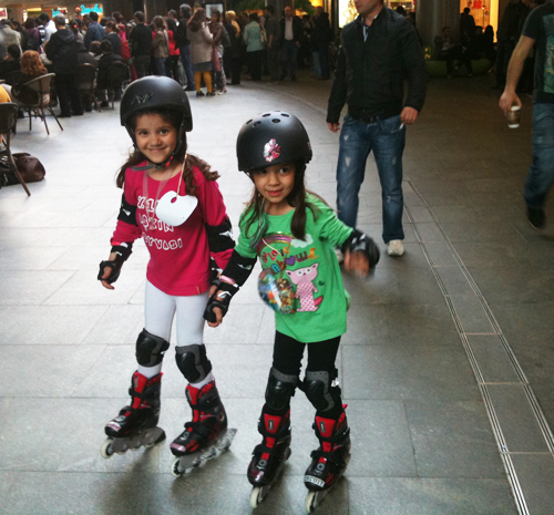 Bu fotoÄŸrafı kışın çekmiÅŸtim, o nedenle çocuklar bu kadar giyinik… Bu arada bu seti nereden aldığımı soranlar oluyor, rollerblade’ler Işıl’ın kızlara doÄŸumgünü hediyesi, Decathlon’dan, kask ve dizlik seti ise Tchibo’dan…
