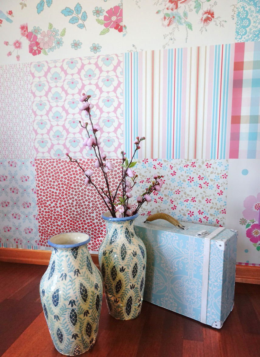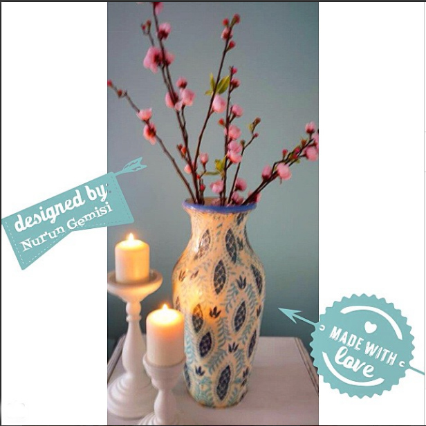 Ardından peçete kaplama tekniği kullanarak en ince katmanına ayırdığım ve çini görünümüne yakın peçeteleri dikkatlice -peçete tutkalı yardımıyla- küplern üzerine yapıştırdım.