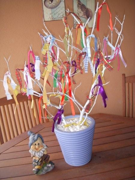 Kızlarla beraber bu kurdeleleri dallara bağladık ve ağacımızı içerisini beyaz taşlarla doldurduğum saksının içine yerleştirdik.