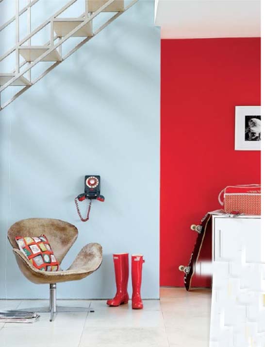 Bu örnekte olduğu gibi kırmızı ve maviyi birarada kullanırsanız mavinin ortamı sakinleştirir, kırmızı da enerjik etkileriyle mavinin ortamı çok soğumasına engel olur, böylelikle her günkü modunuza uyan bir ortam sağlamış olursunuz.
