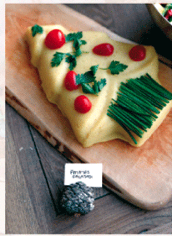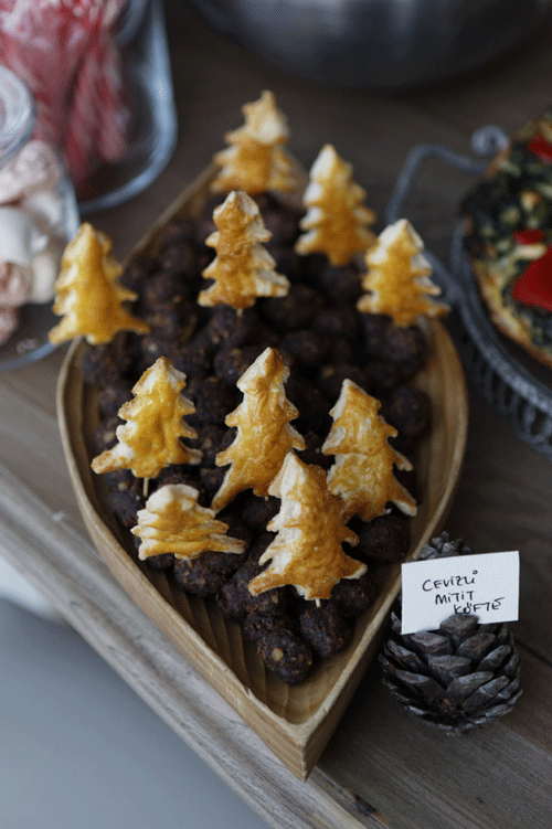 Ancak köftelerin görünümü biraz zayıf kalabiliyor, bu nedenle ve lezzete lezzet katmak için köftelere milföyden yılbaşı ağaçları eşlik etti. Frenk soğanı, maydanoz ve domateslerle süslenen hardallı patates salatası hem lezzetli hem de temaya uygundu