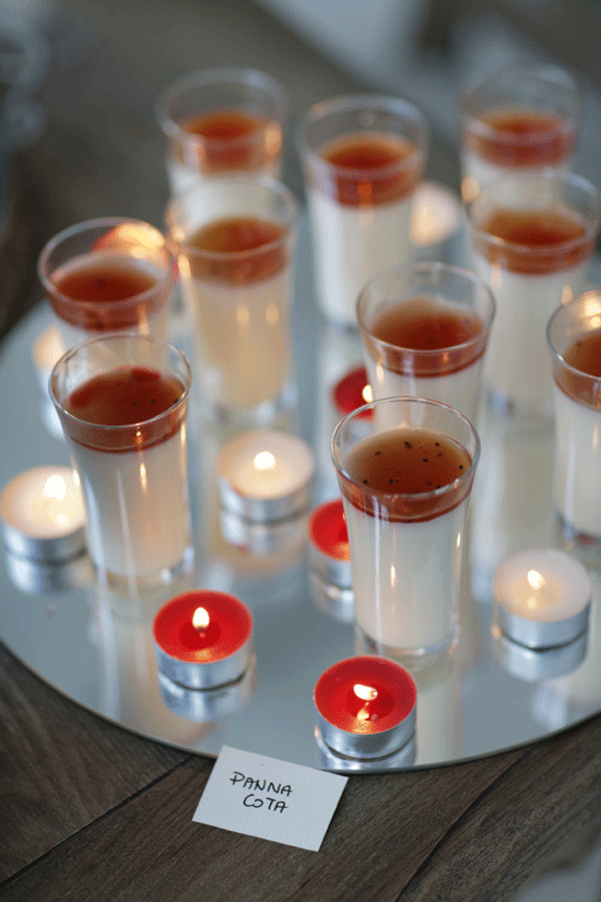 Panna Cottalar ayndan servislik içerisinde kırmızı beyaz mumlarla beraber sunuldu: