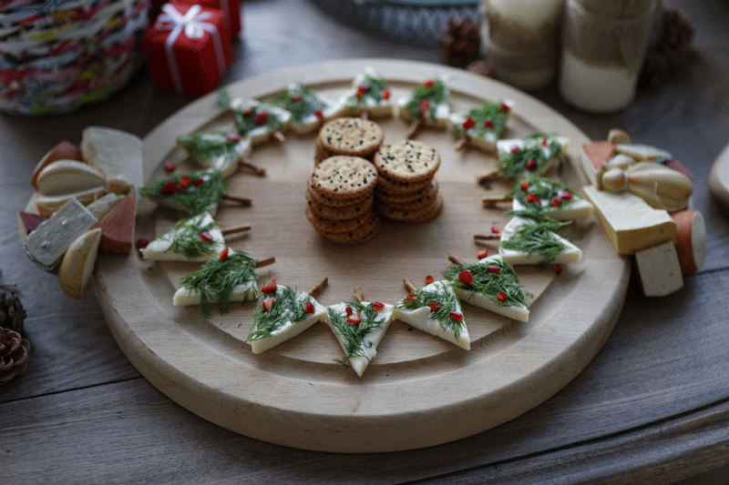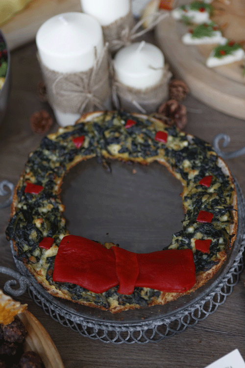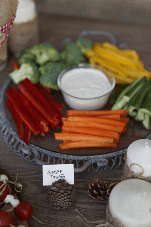 Yemeklerin arasında atıştırmalık peynir ve kraker tabağı(Yılbaşı aÄŸacı görünümlü olarak), tarifini eski bir Evim dergisi editörü olan Gamze Bursa’nın 425 gram adlı kitabından aldığım ıspanaklı simit (Birkaç ekleme yaparak yılbaşı çelengi kılığına girdi), sebze tabağı , mozzarellalı domatesli ÅŸiÅŸler (Pesto soslu olarak, mmmh!) ve meyveli ıspanak salatası da vardı.