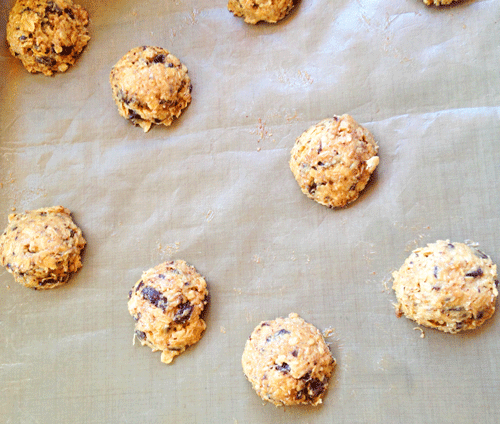 - Parşömen kağıdı serili fırın tepsisine aralarında beşer santim bırakacak şekilde 2 çorba kaşıklık hamuru yerleştirin ve fırına verin. Kurabiyeler büyük olduğu için tepsi başına 6 adet kurabiye yerleştirmenizi tavsiye ediyorum. Eğer Amerikan cup ölçülerine sahip değilseniz ve 2 çorba kaşıklık bir ölçü kaşığınız yoksa 5 santimetre çapında toplar yapıp ortadan ikiye kesebilirsiniz (5 santimetre çapındaki bir kurbiye topu 4 çorba kaşığına denk geliyor, ortadan ikiye kesince istenilen boyutu elde etmiş olacaksınız). Ben Starbucks’dan aldığım 2 çorba kaşıklık (30 ml) ölçü kaşığını kullanıyorum (fotoğraflarda görebilirsiniz).