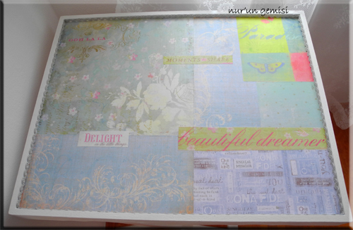 Patchwork mantığıyla dekupaj yöntemiyle yaptım, desenler scrapbook için kullanılan desnelerden, geçtiğimiz seneki Ece Aymer röportajım sırasında almıştım.