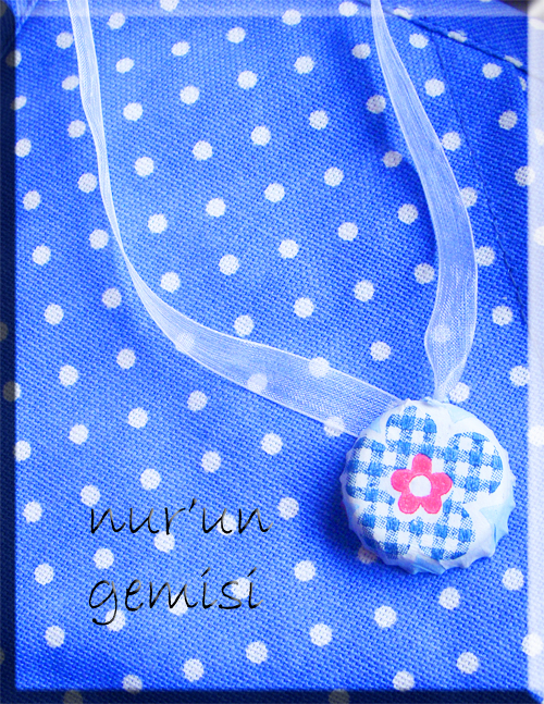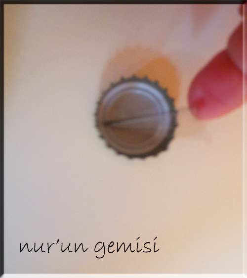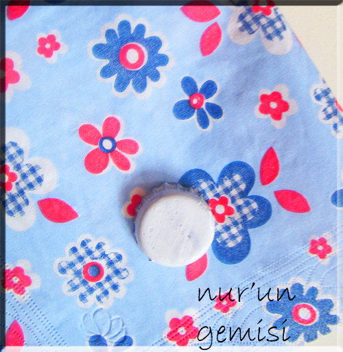Sonra gazoz kapağına dileyen resim çizer, dilemeyen benim gibi önce beyaza boyar, sonra da üzerine peçete veya dekupaj yöntemiyle kağıt tatbik eder.