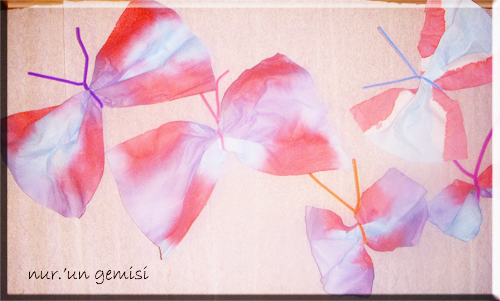 Kuruduktan sonra ortasından şönillerimizi bağlayıp, kelebeklerimizi tamamlıyoruz.