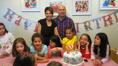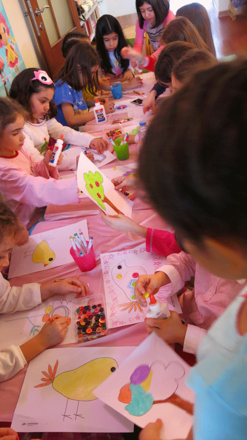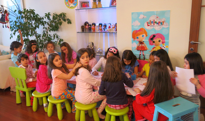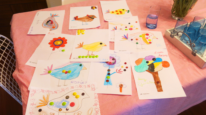 Önce gözleirni kapatıp baykuşu doğru noktaya yerleştirmeye çalıştıkları bir oyun oynadılar, ardından da Lalalloopsy temalı resimleri boya kalemleri ve düğme ile süslediler: