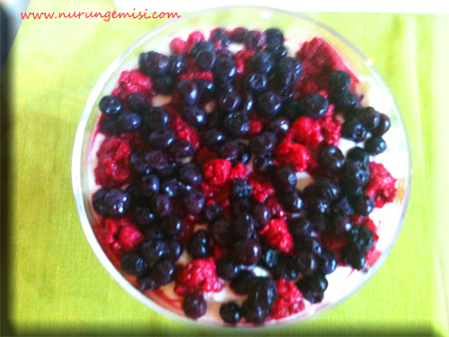 Üzerine bir kat krema döküp, yaban mersini ve frambuazla süsleyin. (DondurulmuÅŸ olarak da satılan bu meyvelerden yoksa, ÅŸeftali üzüm, ya da çilek de harika olur. ) Meyvelerin kenarlardan da görünmesine özellikle dikkat edin. Ben aynı gün sitemize yeni taşınan bir komÅŸumuz için bu tatlının şeftalili, üzümlü versiyonunu da hazırladım…