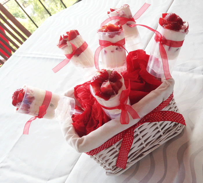 Son olarak beze, krema  çilek sırasına göre kaplara doldurdum.