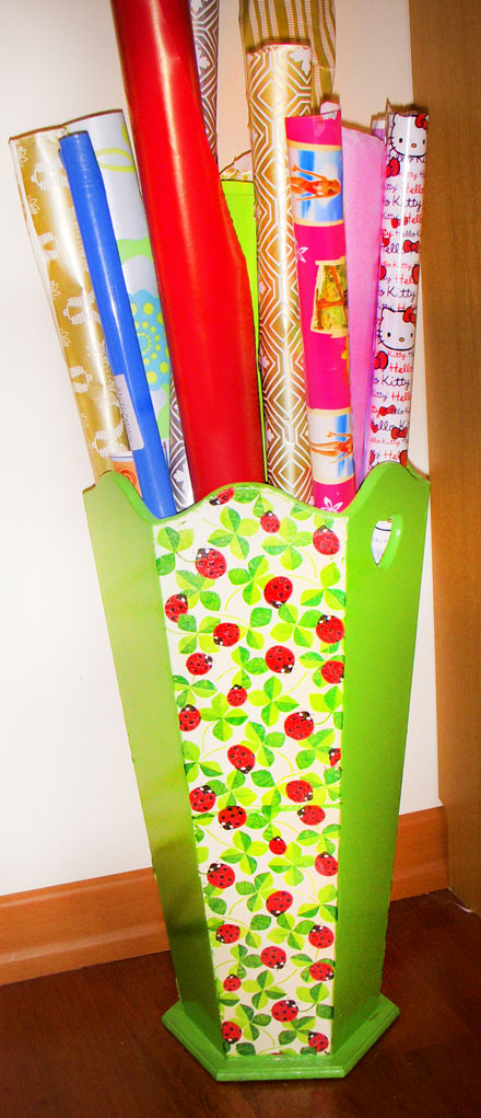 2- Paket kağıtlarımı boyadığım ve peçete kullanarak uğur böcek desenleriyle süslediğim bir şemsiyeliğe yerleştirdim, artık kırışmıyorlar ve dolapta yer işgal etmiyorlar. Bana da dolaba yığabileceğim ıvır zıvırlar, sepetler, kutular için yer açılıyor(!)