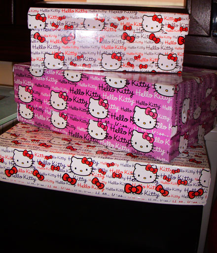 1- Kurdele kutularım var(Tabii Hello kitty’li ve tabii ki bu kutuları da ben kapladım!), bu sayede kurdelelerim derli toplu duruyorlar.