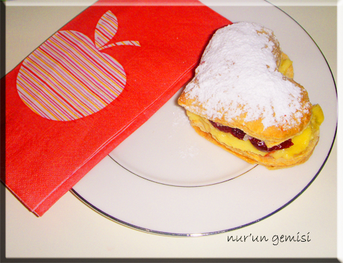 Milföyler fırından çıktıktan sonra, ortadan ikiye bölün, aralarına hazır aldığınız (Sadece sütle çırpılarak pişirmeden hazırlanan kremalar var, ancak içindeki malzemeri okuyunca içinizden almak gelmiyor) veya kendinizin hazırladığınız kremayı* sürün, çilek, frambuaz veya vişnelerle süsleyin, kapak kısmını kapatın. Son olarak en üst kısma pudra şekeri dökün!