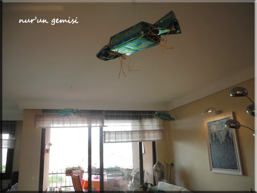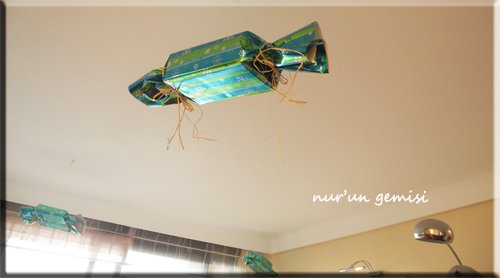 Bu şekerleri salonumuzun tava nından sarkıttım ve çocukların onları  farketmesini heyecanla beklemeye başladım